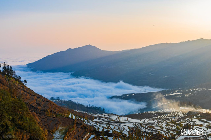 2月-3月是哈尼梯田的“丰水期”,注水梯田如银镜映云天,云海缠田垄。