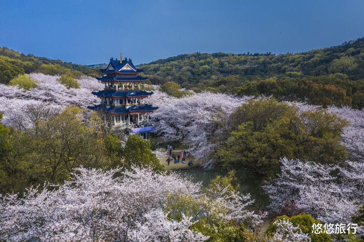 3月下旬鼋头渚樱花满树烂漫,登上赏樱楼,粉白花海环绕蓝色琉璃瓦。
